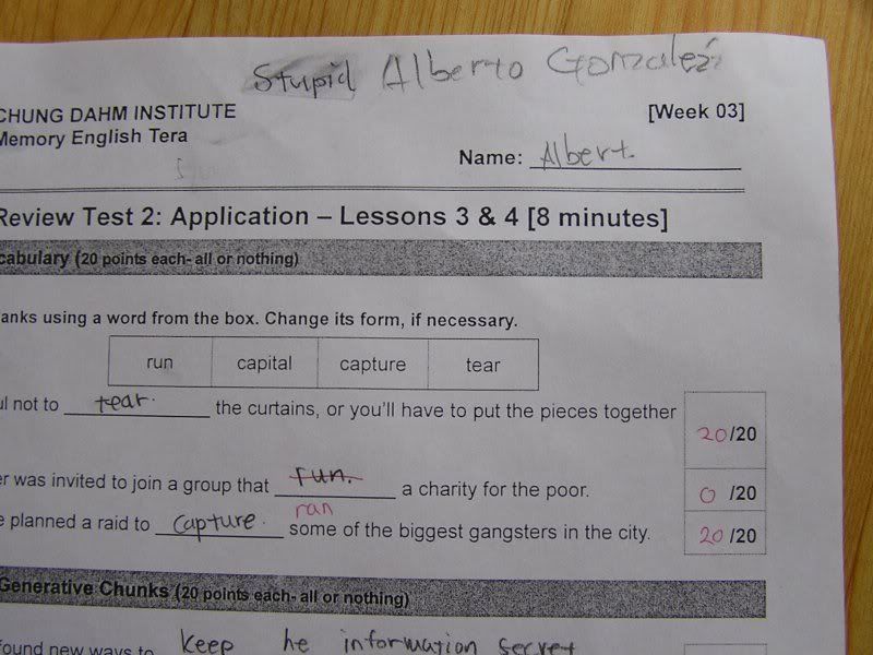 One day I was telling him about former U.S. Attorney General Alberto Gonzales. That day we had a few minutes of free time at the end of class, so I pulled up a YouTube montage of his "I don't recall" Senate testimony. The video shows his 70+ repetitions of the phrase.