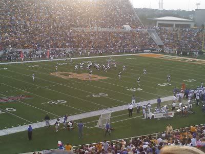 I got some free tickets, so yesterday I took a couple of buds to a college football game. It was kind of funny, because at first I thought it was for a local college -- University of Mary Hardin Baylor, a Division III school -- when in fact it was for Baylor University (a Division I school) up in Waco.
